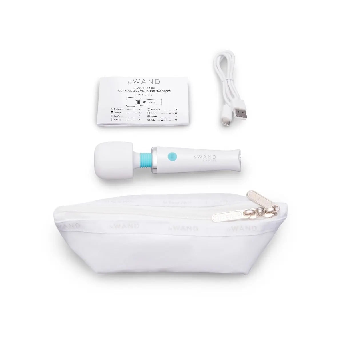 Der Kopf des Le Wand Classique Mini ist mit körperfreundlichem, nicht-porösen Silikon überzogen und er kommt in einer hochwertigen Verpackung mit Reisetäschchen.