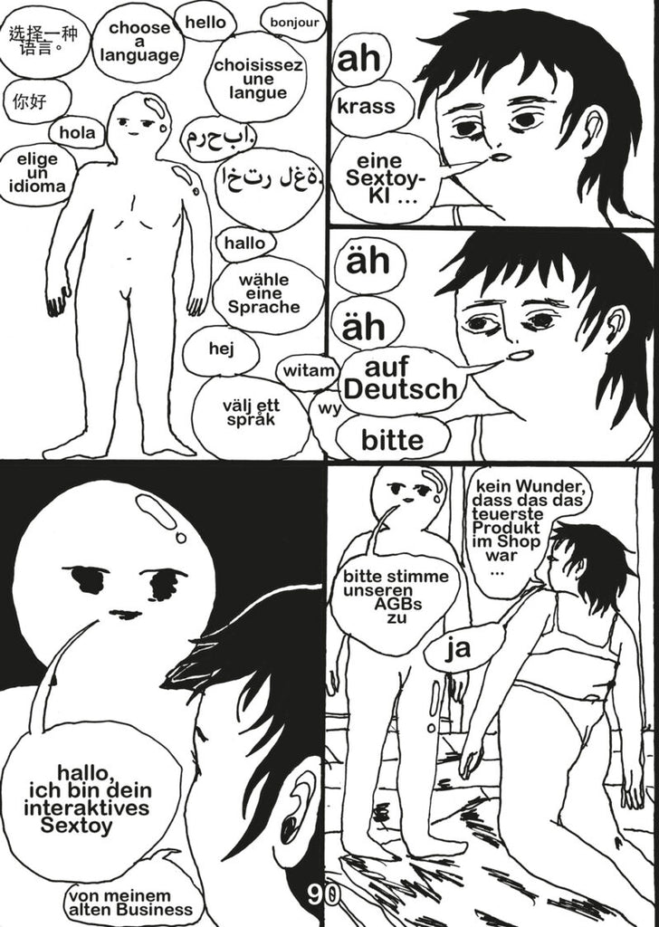 «Was ist menschlich? In Zeiten der Verbreitung Künstlicher Intelligenz stellen wir uns diese Frage ständig. Lina Ehrentraut führt es in Toys gut vor: Gefühle, Ängste und Bedürfnisse rund um Intimität, Beziehungen und Begehren sind wichtige Bestandteile der menschlichen Erfahrung. Ehrentraut zeichnet all dies, ohne dass es je cringe, aufgesetzt oder technisch wirkt. Dabei besticht Ehrentraut obendrein mit Humor und grossartigen Dialogen, sowie dem Einsatz von Mode und Musik. Diesen Comic zu lesen macht Spass — und nachdenklich.» — Hengameh Yaghoobifarah, Schriftsteller*in und Journalist*in